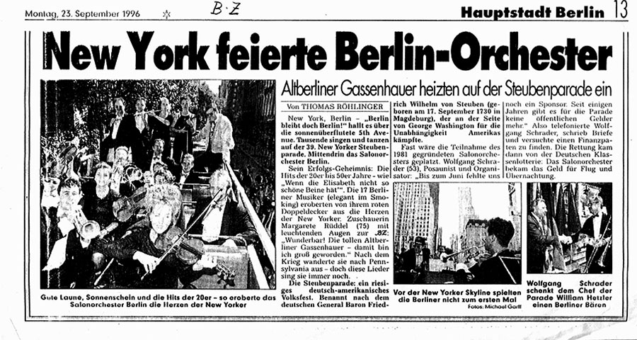 1996 fuhr das Salon Orchester Berlin nach New York und spielte dort auf der Steuben-Parade und bei einem weiteren Engagement in New-Jersey.